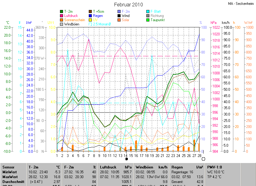 Der wärmste Tag war der 28.02.2010 um 12:30 mit 16.8°C. Am kältesten war es mit -5.3°C am 10.02.2010 um 23:40.