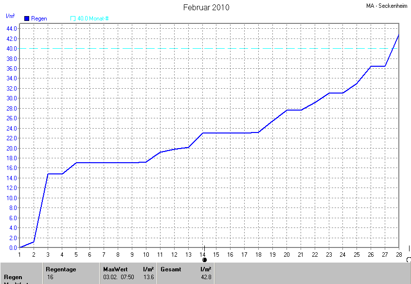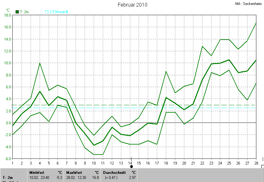 Die Durchschnittstemperatur für den Monat Februar 2010 lag bei 2.97°C. Die Abweichung vom langjährigen Mittel war +0.47°C.
