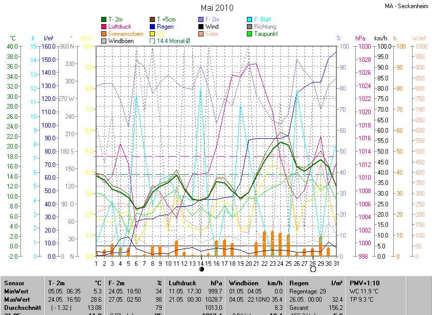 Der wärmste Tag war der 24.05.2010 um 16:50 mit 28.6°C. Am kältesten war es mit 5.3°C am 05.05.2010 um 06:35.