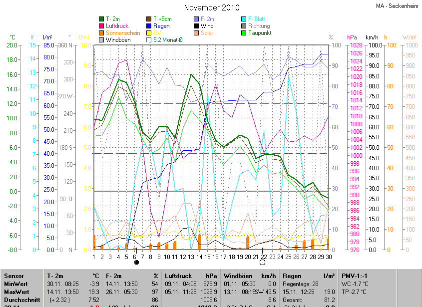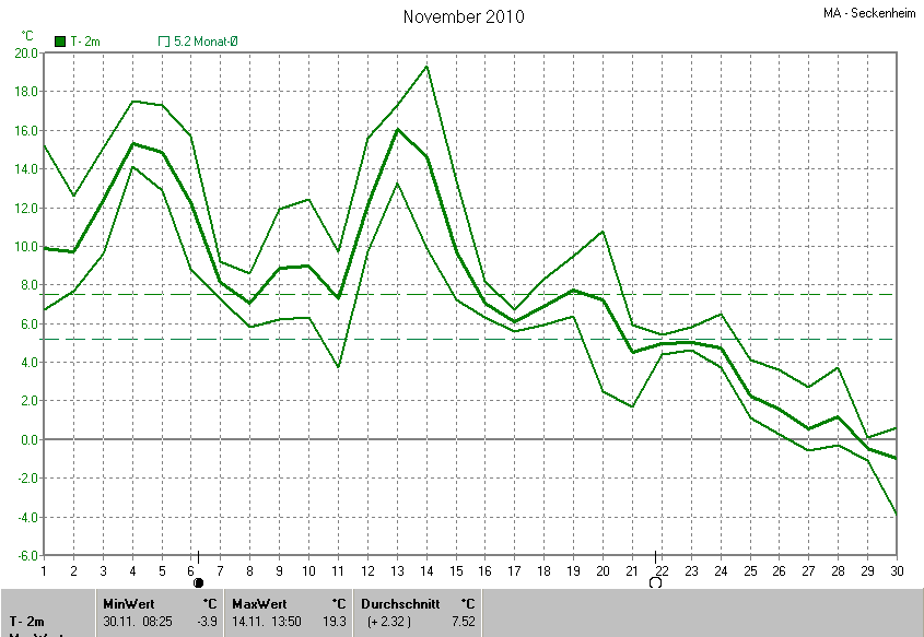 Der wärmste Tag war der 14.11.2010 um 13:50 mit 19.3°C. Am kältesten war es mit -3.9°C am 30.11.2010 um 08:25.
