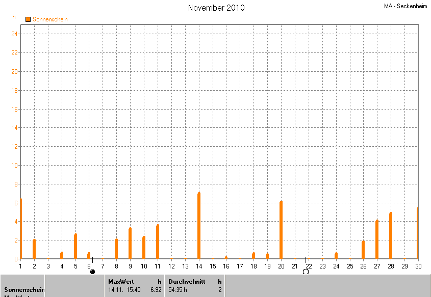 Dargestellt wird die grafische Übersicht für die Sonnenscheinzeit. Zu sehen sind immer die täglichen Sonnenstunden (von 0-24 Uhr):