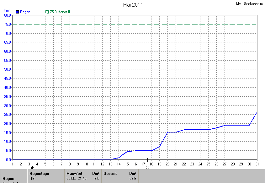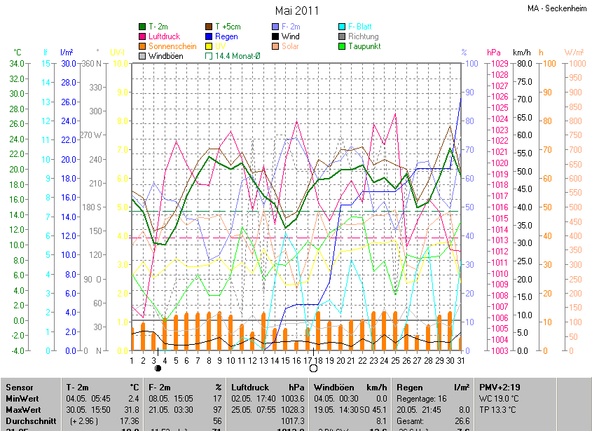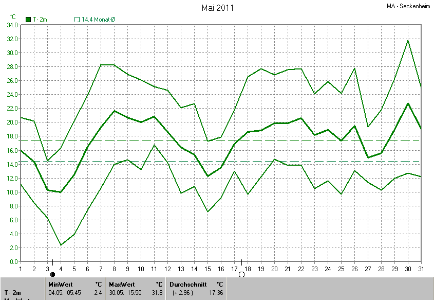 Der wärmste Tag war der 30.05.2011 um 15:50 mit 31.8°C. Am kältesten war es mit 2.4°C am 04.05.2011 um 05:45.