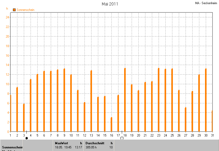 Dargestellt wird die grafische Übersicht für die Sonnenscheinzeit. Zu sehen sind immer die täglichen Sonnenstunden (von 0-24 Uhr):