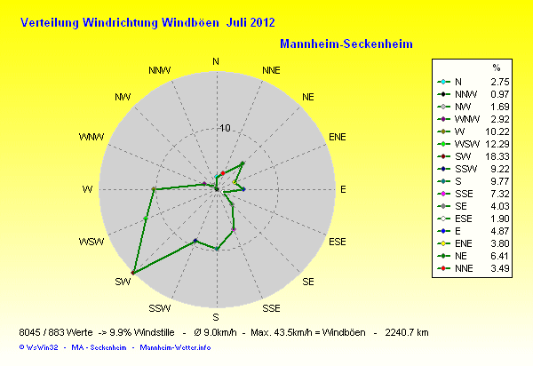 Der wärmste Tag war der 27.07.2012 um 16:00 mit 35.7°C. Am kältesten war es mit 9.4°C am 22.07.2012 um 05:35.
