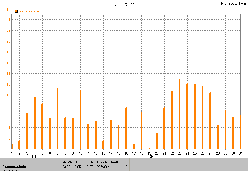 Dargestellt wird die grafische Übersicht für die Sonnenscheinzeit. Zu sehen sind immer die täglichen Sonnenstunden (von 0-24 Uhr):