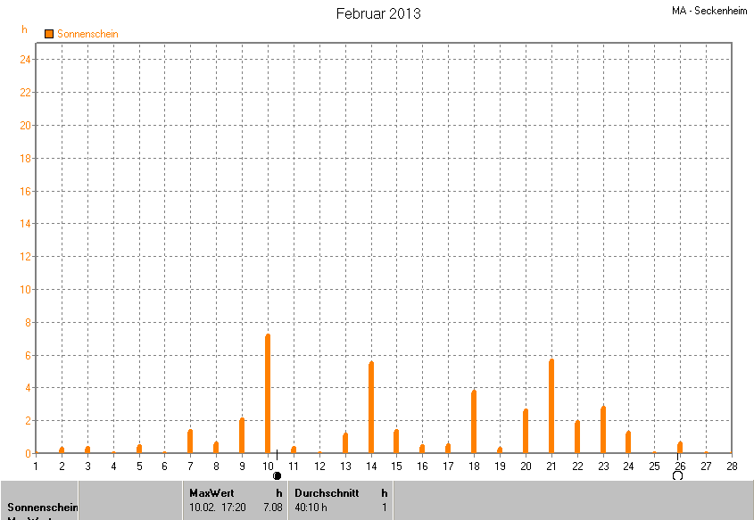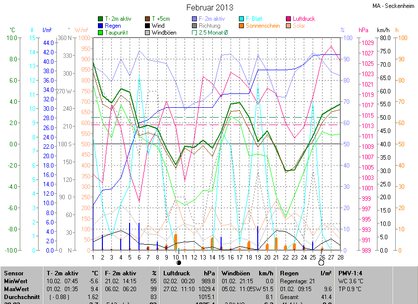 Der wärmste Tag war der 01.02.2013 um 01:35 mit 9.4°C. Am kältesten war es mit -5.6°C am 10.02.2013 um 07:45.