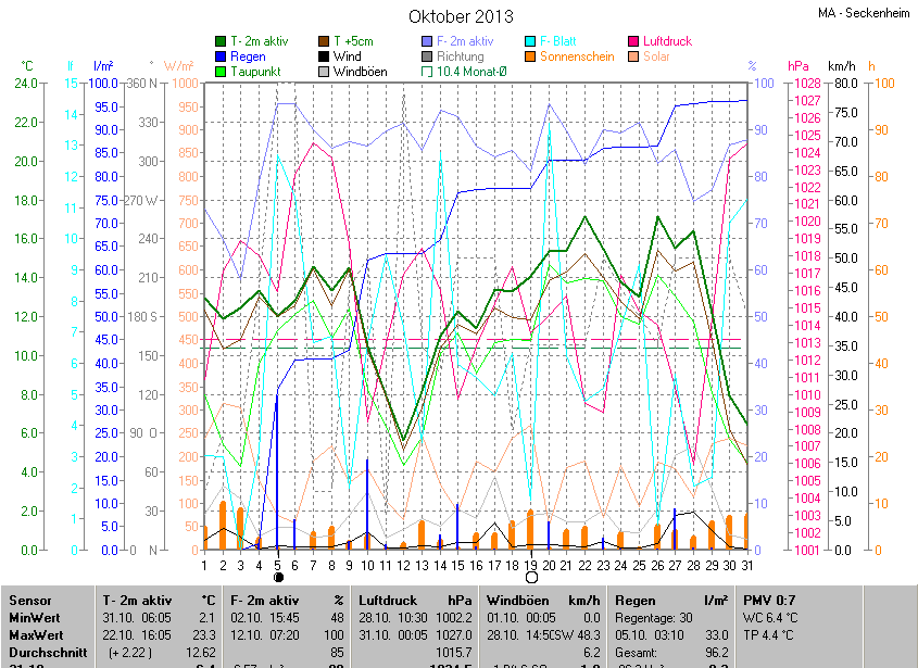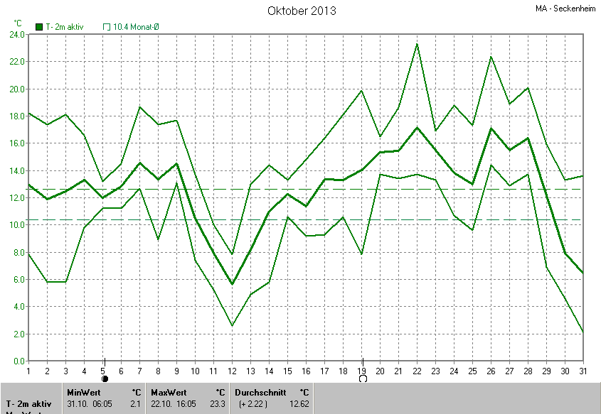 Der wärmste Tag war der 22.10.2013 um 16:05 mit 23.3°C. Am kältesten war es mit 2.1°C am 31.10.2013 um 06:05.