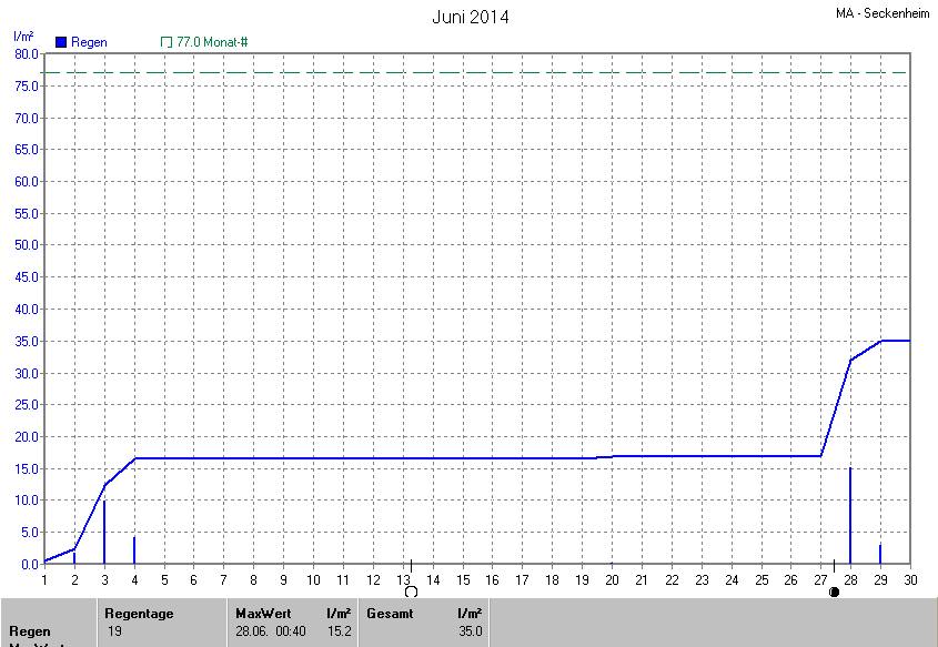 Die gesamte Regenmenge lag bei 35.0l/m² (entspricht: 45.5%) und war damit um -42.0l/m² vom langjährigen Wert entfernt. Niederschlag gab es an 7Tagen. Mehr als 2mm Regen gab es an 4Tagen. Sehr viel Regen mit mehr als 20mm pro Tag gab es an 0Tagen.