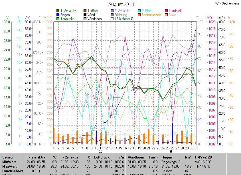 Die Durchschnittstemperatur für den Monat August 2014 lag bei 18.19°C. Die Abweichung vom langjährigen Mittel war -0.61°C.