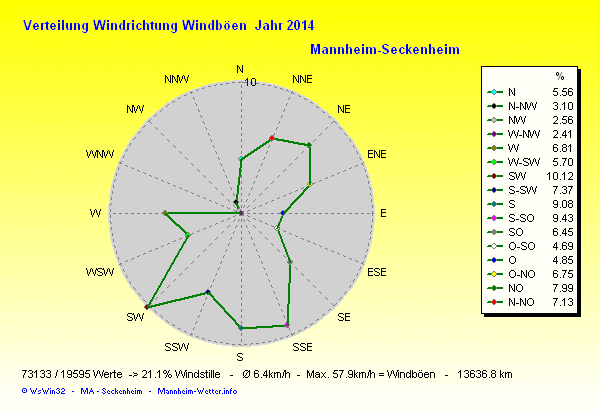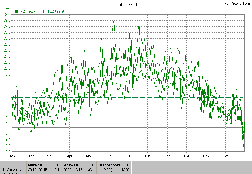 Die Durchschnittstemperatur für das Jahr 2014 lag bei 12.80°C. Die Abweichung vom langjährigen Mittel war +2.60°C.