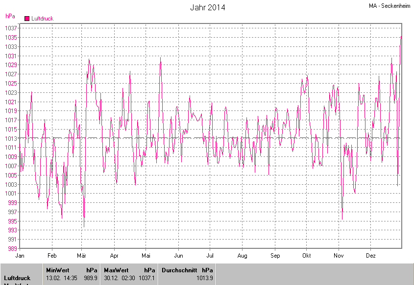 Am wärmsten war es am 09.06.2014 um 16:15 mit 36.4°C. Am kältesten mit -6.4°C am 29.12.2014 um 03:45.