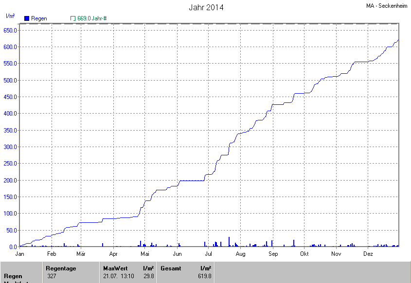 Die gesamte Regenmenge lag bei 619.8l/m² ( 92.6%) und war damit um -49.2l/m² vom langjährigen Wert entfernt. Niederschlag gab es an 194Tagen. Mehr als 2mm Regen gab es an 84Tagen. Sehr viel Regen mit mehr als 20mm pro Tag gab es an 2Tagen.