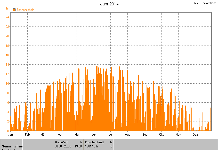 Dargestellt wird die grafische Übersicht für die Sonnenscheinzeit. Zu sehen sind immer die täglichen Zeiten (von 0-24 Uhr):