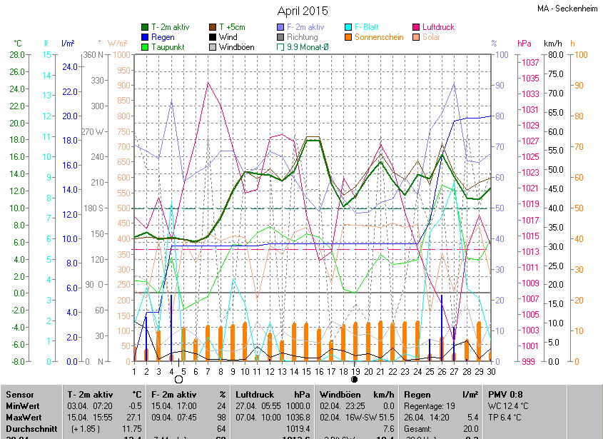 Der wärmste Tag war der 15.04.2015 um 15:55 mit 27.1°C. Am kältesten war es mit -0.5°C am 03.04.2015 um 07:20.