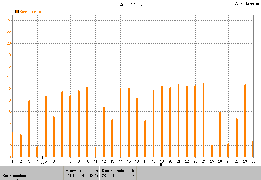 Dargestellt wird die grafische Übersicht für die Sonnenscheinzeit. Zu sehen sind immer die täglichen Sonnenstunden (von 0-24 Uhr):