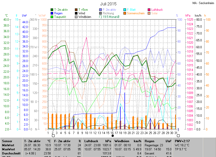 Der wärmste Tag war der 05.07.2015 um 14:20 mit 38.8°C. Am kältesten war es mit 10.9°C am 26.07.2015 um 06:30.