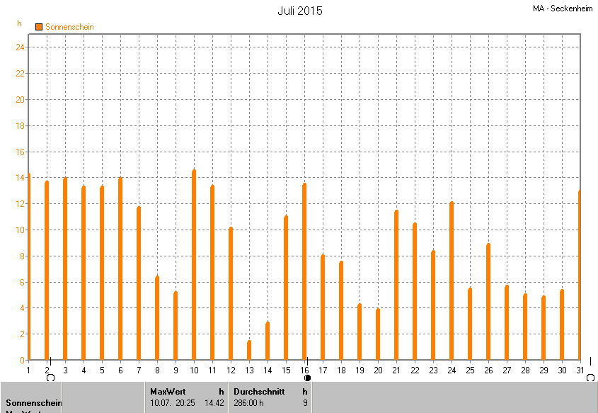 Dargestellt wird die grafische Übersicht für die Sonnenscheinzeit. Zu sehen sind immer die täglichen Sonnenstunden (von 0-24 Uhr):