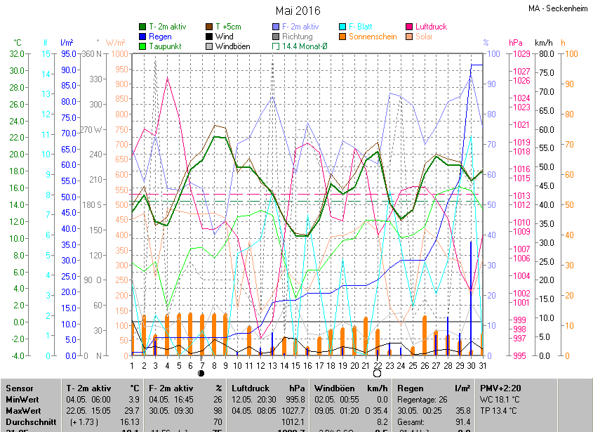 Die Durchschnittstemperatur für den Monat Mai 2016 lag bei 16.13°C. Die Abweichung vom langjährigen Mittel war +1.73°C.