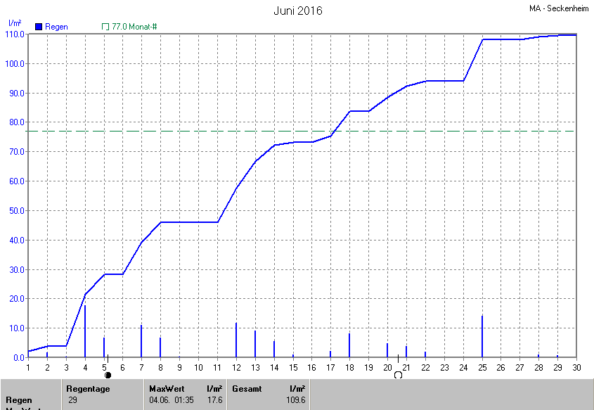 Die gesamte Regenmenge lag bei 109.6l/m² (entspricht: 142.3%) und war damit um +32.6l/m² vom langjährigen Wert entfernt. Niederschlag gab es an 20Tagen. Mehr als 2mm Regen gab es an 13Tagen. Sehr viel Regen mit mehr als 20mm pro Tag gab es an 0Tagen.