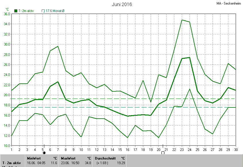 Der wärmste Tag war der 23.06.2016 um 16:50 mit 34.8°C. Am kältesten war es mit 11.6°C am 16.06.2016 um 04:05.