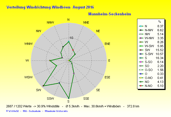 Der wärmste Tag war der 27.08.2016 um 16:15 mit 34.9°C. Am kältesten war es mit 8.3°C am 11.08.2016 um 06:30.