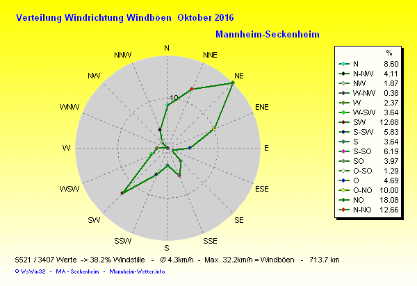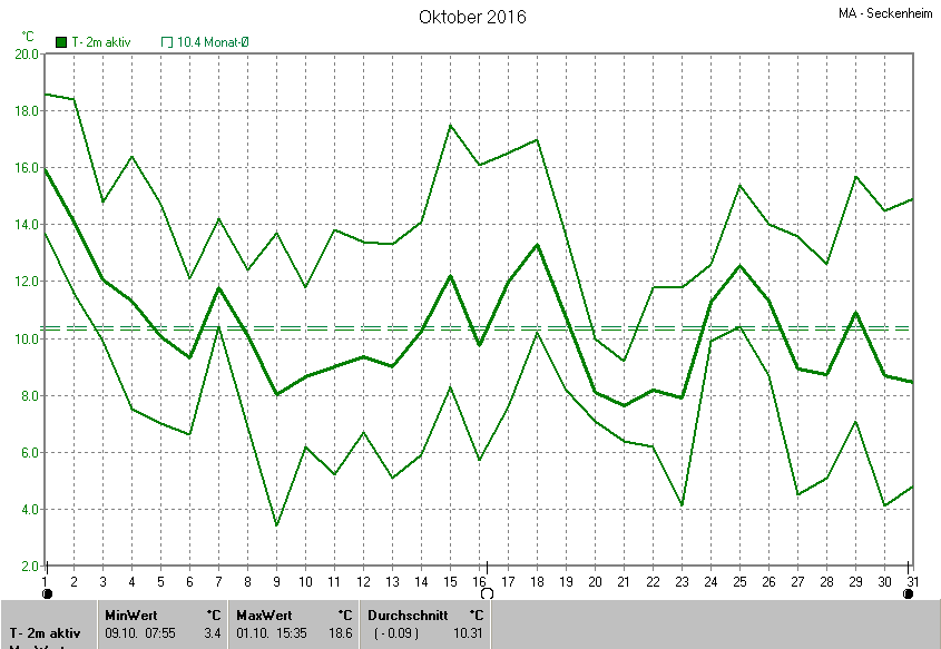 Die Durchschnittstemperatur für den Monat Oktober 2016 lag bei 10.31°C. Die Abweichung vom langjährigen Mittel war -0.09°C.