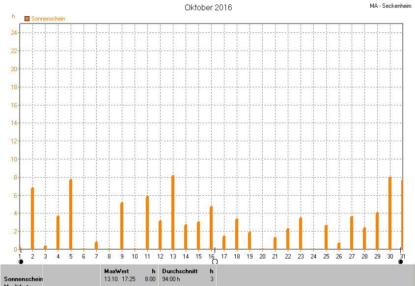 Dargestellt wird die grafische Übersicht für die Sonnenscheinzeit. Zu sehen sind immer die täglichen Sonnenstunden (von 0-24 Uhr):