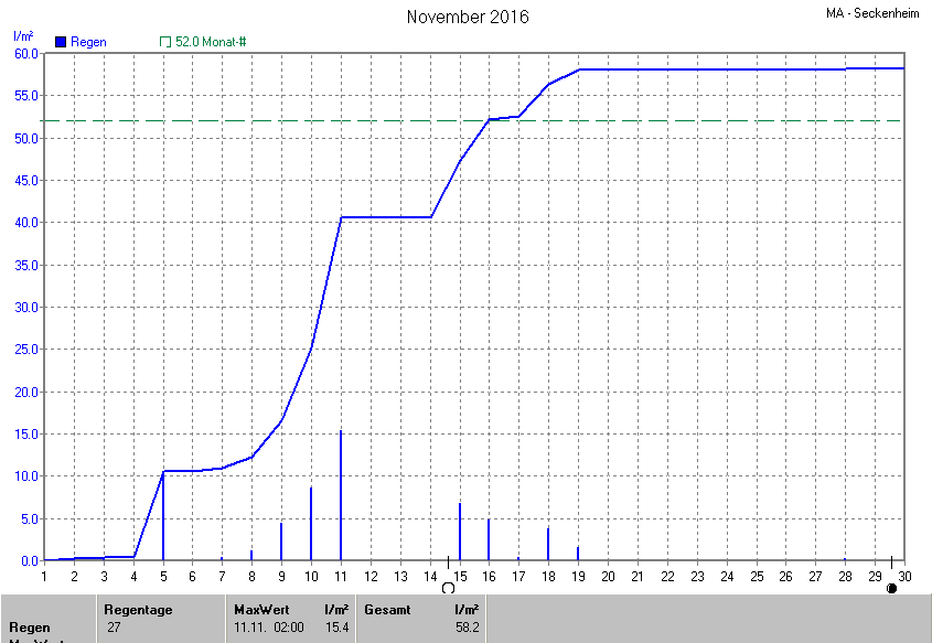 Dargestellt wird die grafische Übersicht für den Niederschlag. Zu sehen sind immer die täglichen Niederschlagsmengen (von 0-24 Uhr) und in der ansteigenden Linie die Summe aller Niederschläge: