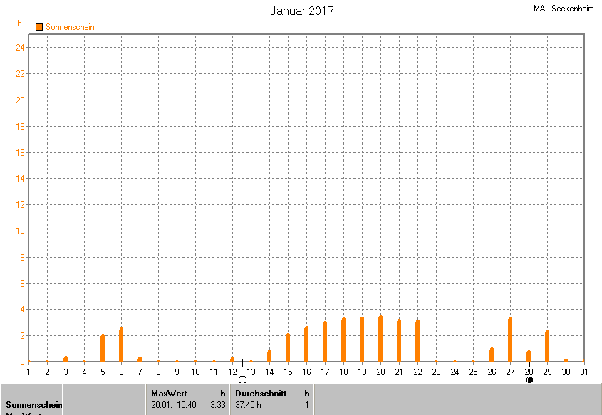 Dargestellt wird die grafische Übersicht für die Sonnenscheinzeit. Zu sehen sind immer die täglichen Sonnenstunden (von 0-24 Uhr):