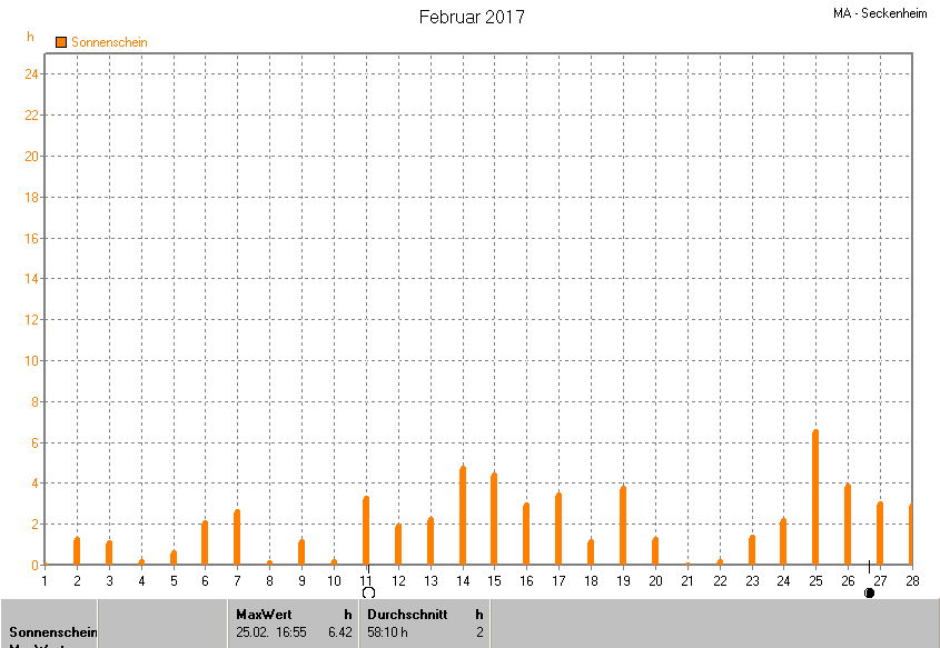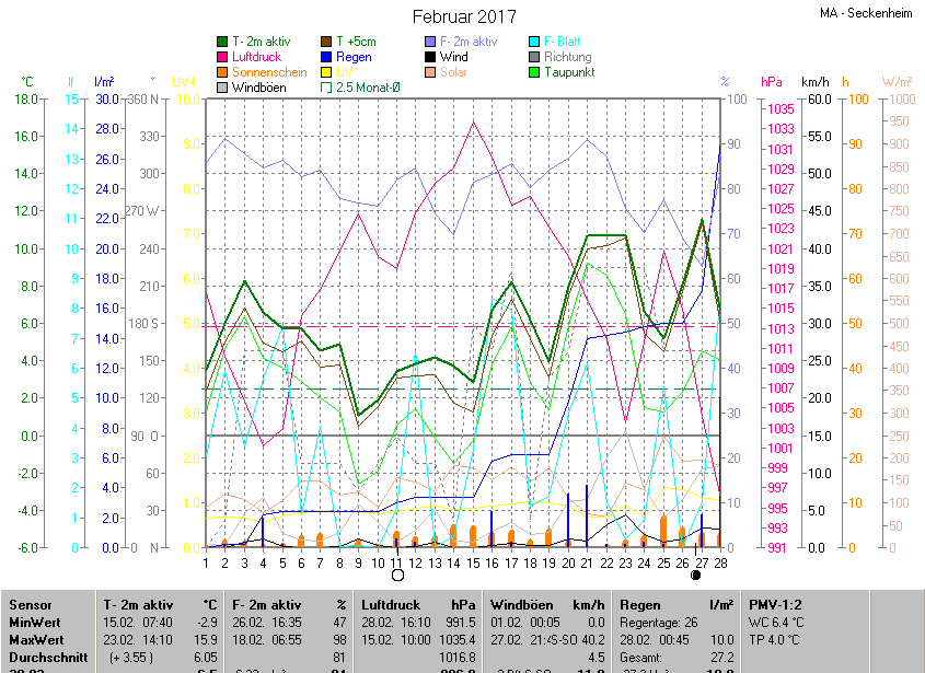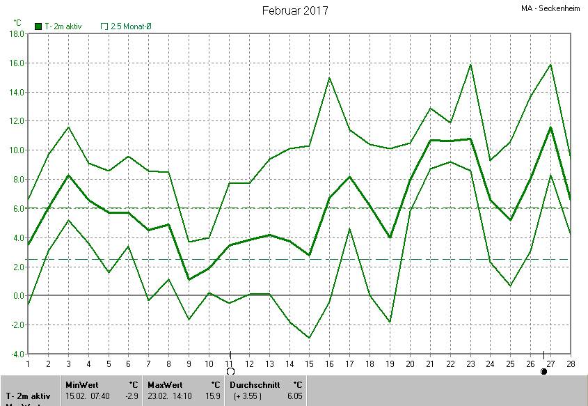 Die Durchschnittstemperatur für den Monat Februar 2017 lag bei 6.05°C. Die Abweichung vom langjährigen Mittel war +3.55°C.