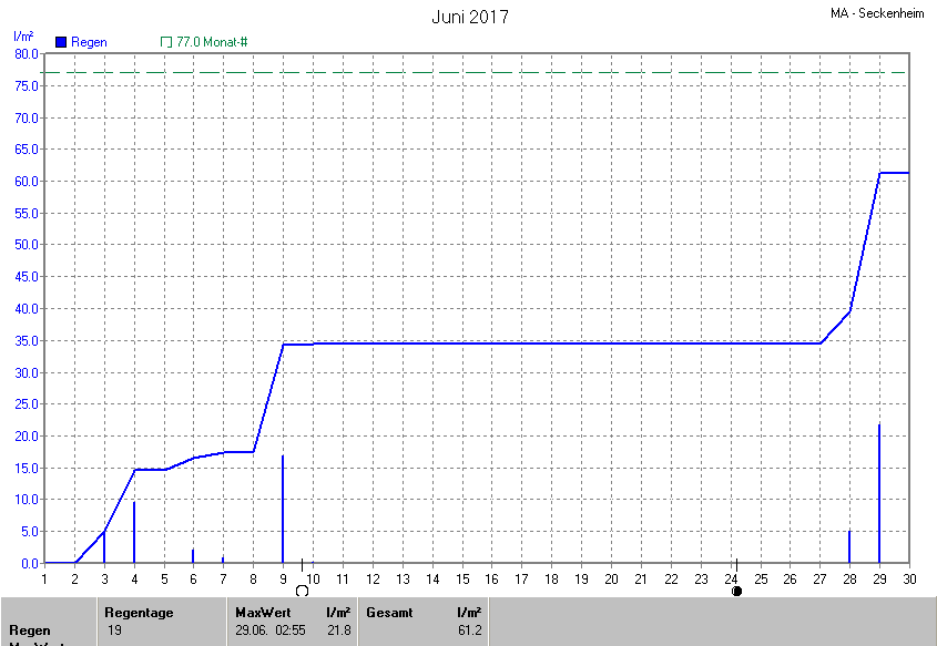Die gesamte Regenmenge lag bei 61.2l/m² (entspricht: 79.5%) und war damit um -15.8l/m² vom langjährigen Wert entfernt. Niederschlag gab es an 8Tagen. Mehr als 2mm Regen gab es an 6Tagen. Sehr viel Regen mit mehr als 20mm pro Tag gab es an 1Tagen.