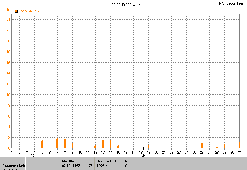 Der wärmste Tag war der 31.12.2017 um 14:20 mit 14.6°C. Am kältesten war es mit -3.0°C am 02.12.2017 um 08:30.