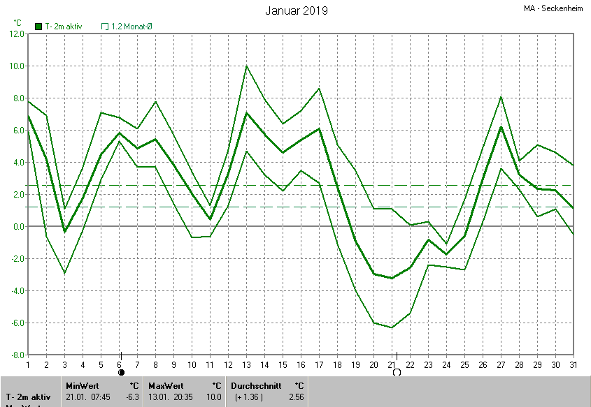 Die Durchschnittstemperatur für den Monat Januar 2019 lag bei 2.56°C. Die Abweichung vom langjährigen Mittel war +1.36°C.