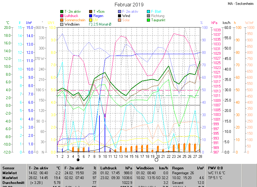 Der wärmste Tag war der 28.02.2019 um 14:45 mit 19.4°C. Am kältesten war es mit -2.2°C am 14.02.2019 um 06:40.