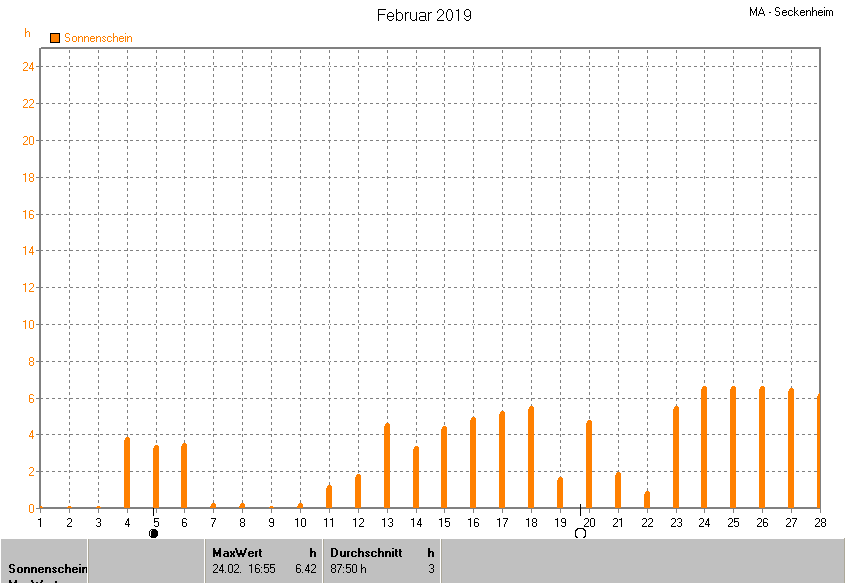 Dargestellt wird die grafische Übersicht für die Sonnenscheinzeit. Zu sehen sind immer die täglichen Sonnenstunden (von 0-24 Uhr):