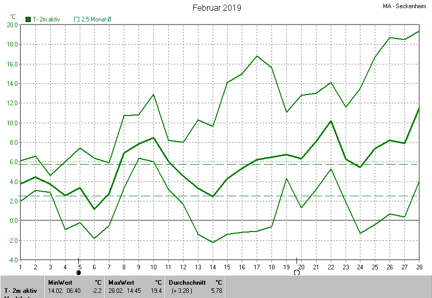 Die Durchschnittstemperatur für den Monat Februar 2019 lag bei 5.78°C. Die Abweichung vom langjährigen Mittel war +3.28°C.
