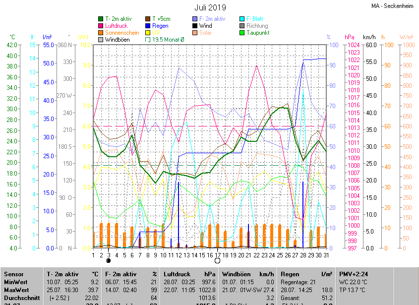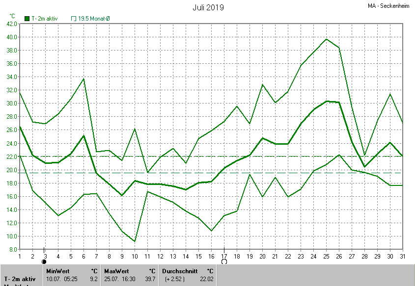 Die Durchschnittstemperatur für den Monat Juli 2019 lag bei 22.02°C. Die Abweichung vom langjährigen Mittel war +2.52°C.