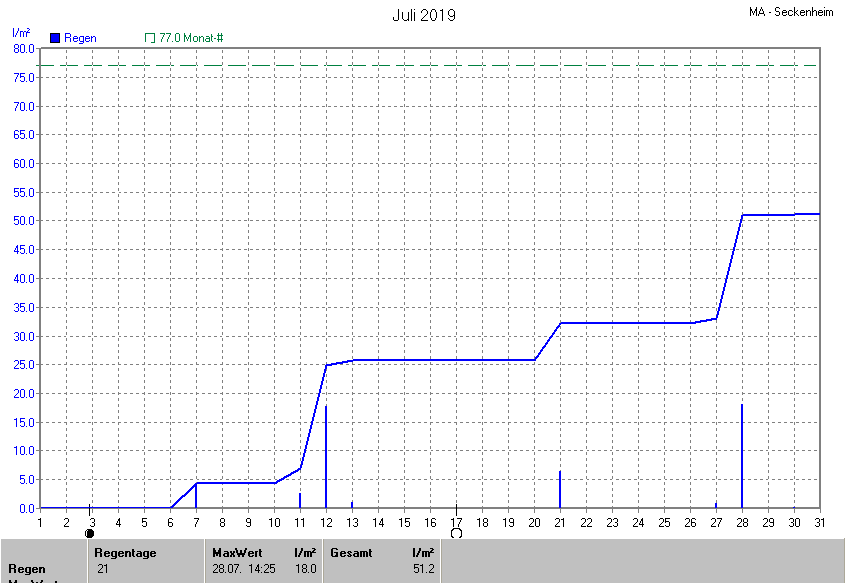 Dargestellt wird die grafische Übersicht für den Niederschlag. Zu sehen sind immer die täglichen Niederschlagsmengen (von 0-24 Uhr) und in der ansteigenden Linie die Summe aller Niederschläge: