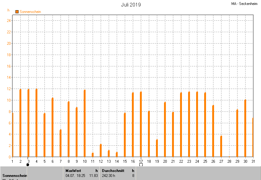 Dargestellt wird die grafische Übersicht für die Sonnenscheinzeit. Zu sehen sind immer die täglichen Sonnenstunden (von 0-24 Uhr):