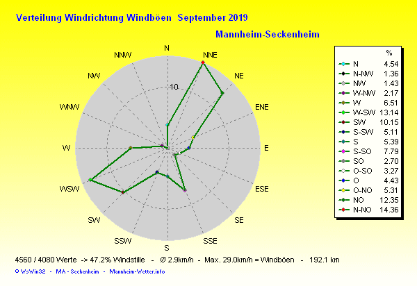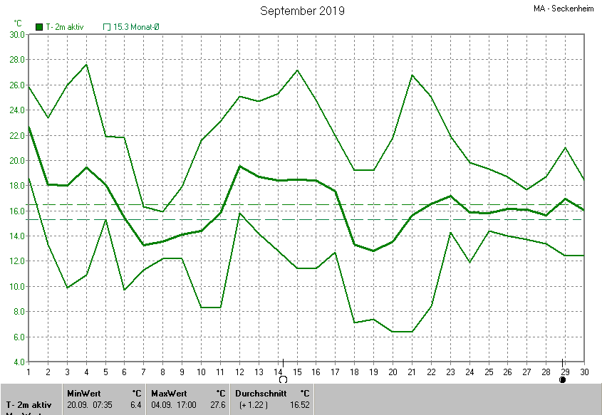 Die Durchschnittstemperatur für den Monat September 2019 lag bei 16.52°C. Die Abweichung vom langjährigen Mittel war +1.22°C.