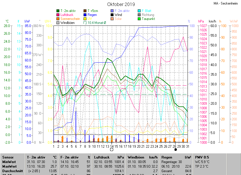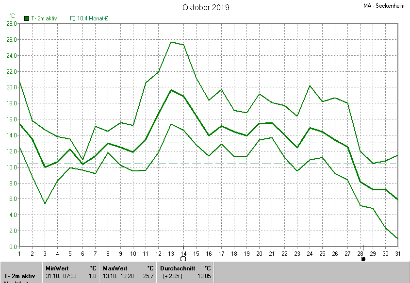 Der wärmste Tag war der 13.10.2019 um 16:20 mit 25.7°C. Am kältesten war es mit 1.0°C am 31.10.2019 um 07:30.