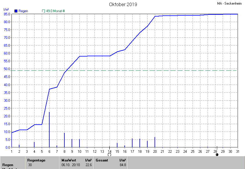 Dargestellt wird die grafische Übersicht für den Niederschlag. Zu sehen sind immer die täglichen Niederschlagsmengen (von 0-24 Uhr) und in der ansteigenden Linie die Summe aller Niederschläge:
