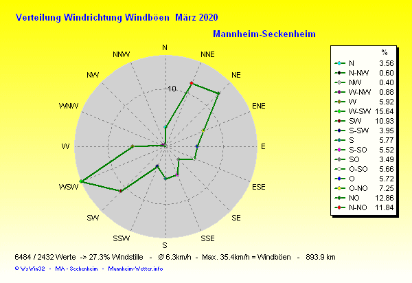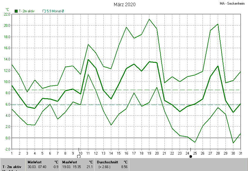 Die Durchschnittstemperatur für den Monat März 2020 lag bei 8.56°C. Die Abweichung vom langjährigen Mittel war +2.66°C.
