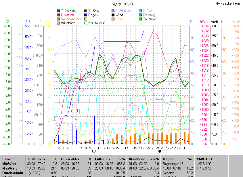 Der wärmste Tag war der 19.03.2020 um 15:35 mit 21.1°C. Am kältesten war es mit -0.9°C am 30.03.2020 um 07:40.
