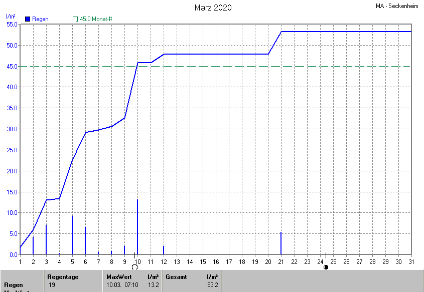 Die gesamte Regenmenge lag bei 53.2l/m² (entspricht: 118.2%) und war damit um +8.2l/m² vom langjährigen Wert entfernt. Niederschlag gab es an 12Tagen. Mehr als 2mm Regen gab es an 8Tagen. Sehr viel Regen mit mehr als 20mm pro Tag gab es an 0Tagen.