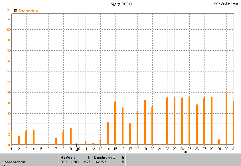 Dargestellt wird die grafische Übersicht für die Sonnenscheinzeit. Zu sehen sind immer die täglichen Sonnenstunden (von 0-24 Uhr):
