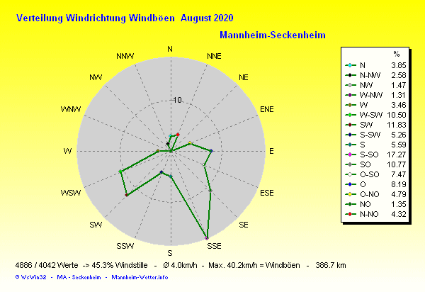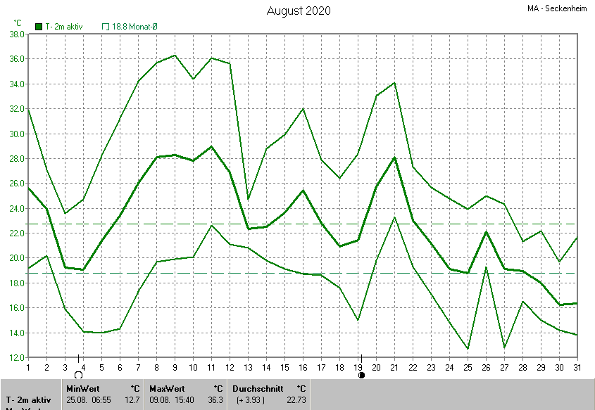 Die Durchschnittstemperatur für den Monat August 2020 lag bei 22.73°C. Die Abweichung vom langjährigen Mittel war +3.93°C.