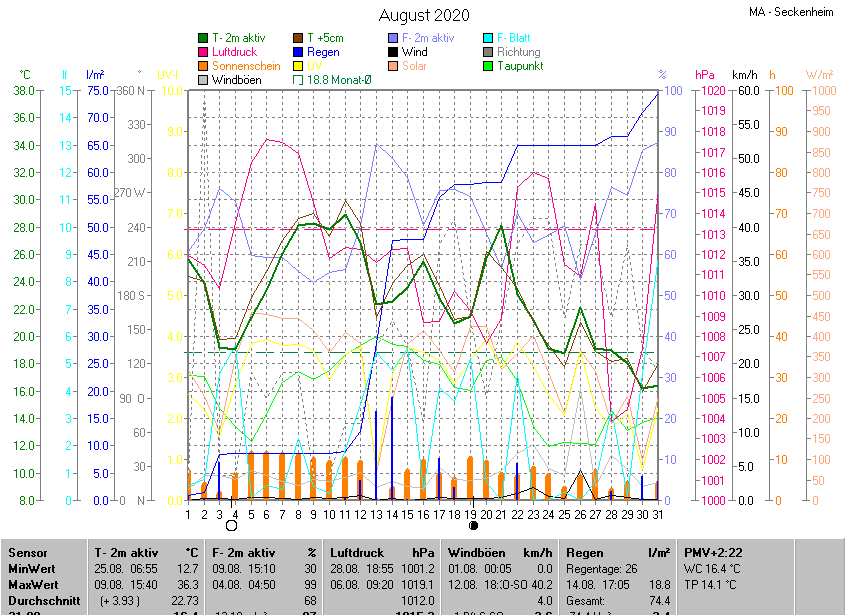Der wärmste Tag war der 09.08.2020 um 15:40 mit 36.3°C. Am kältesten war es mit 12.7°C am 25.08.2020 um 06:55.