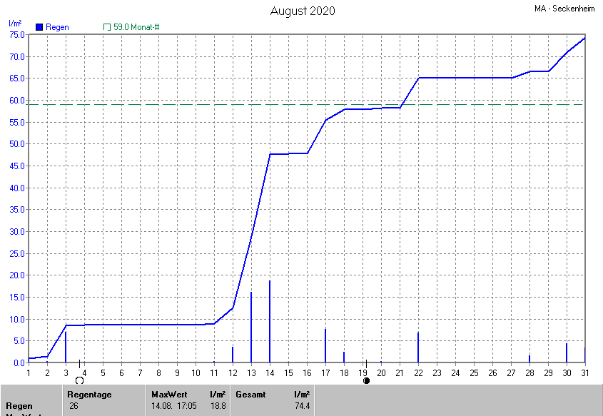 Die gesamte Regenmenge lag bei 74.4l/m² (entspricht: 126.1%) und war damit um +15.4l/m² vom langjährigen Wert entfernt. Niederschlag gab es an 16Tagen. Mehr als 2mm Regen gab es an 9Tagen. Sehr viel Regen mit mehr als 20mm pro Tag gab es an 0Tagen.