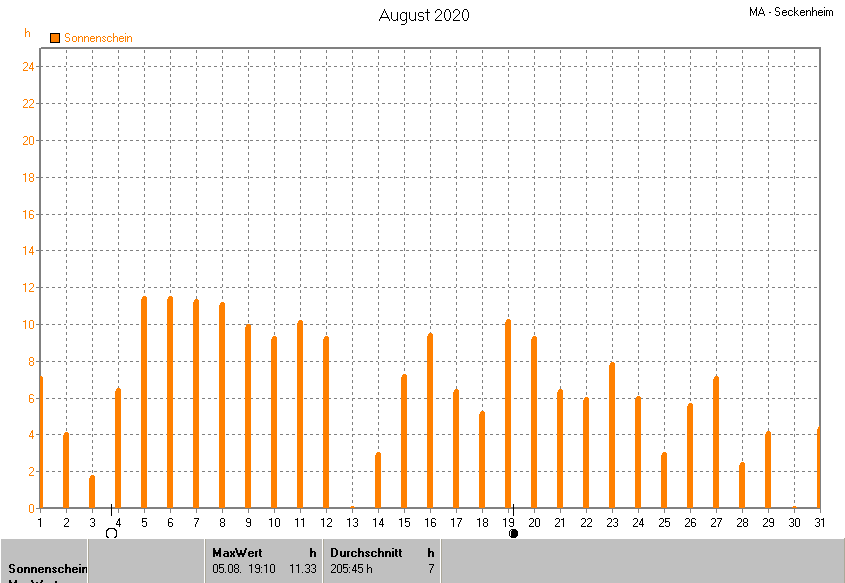 Dargestellt wird die grafische Übersicht für die Sonnenscheinzeit. Zu sehen sind immer die täglichen Sonnenstunden (von 0-24 Uhr):